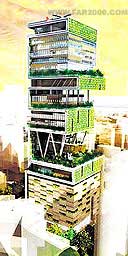 用一座神秘的島嶼Antilla命名的建筑,其總建筑面積將超過凡爾賽宮,成為Ambani和他的妻子、三個(gè)孩子以及600名全職員工的住所。建筑有一層用作家庭劇院,用玻璃做立面的公寓是位客人準(zhǔn)備的,另外還有兩層的健身俱樂部。由于天花板的高度是普通建筑的3倍,這座173米的建筑只有27層。