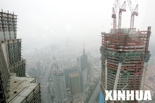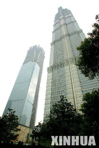 正在建設(shè)中的上海環(huán)球金融中心(左)已升至79層,高度達(dá)到340.1米(1月22日攝)。