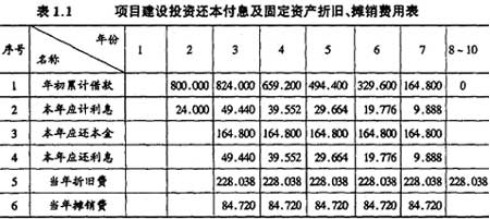 表1.1    項目建設投資還本付息及固定資產(chǎn)折舊、攤銷費用表