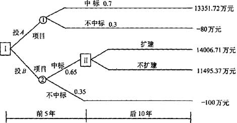 3.據(jù)估計:投A項目中標概率為0.7,不中標費用損失80萬元;投B項目中標概率為0.65,不中標費用損失l00萬元。若投B項目中標并建成經(jīng)營5年后,可以自行決定是否擴建,如果擴建,其擴建投資4000萬元,擴建后B項目每年運營收益增加1000萬元。