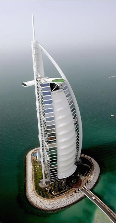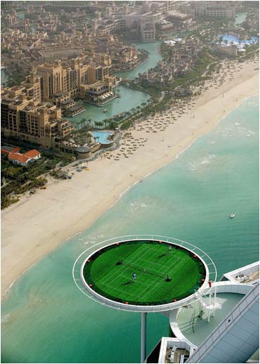 圖為位于迪拜海域七星級(jí)酒店“阿拉伯塔”飯店頂端的一個(gè)獨(dú)一無(wú)二的空中網(wǎng)球場(chǎng),據(jù)稱此網(wǎng)球場(chǎng)原是直升機(jī)停機(jī)坪。