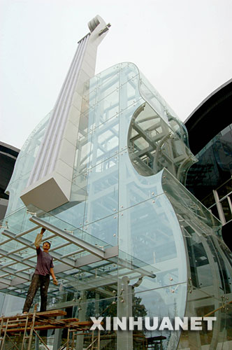 9月18日,工人為“鋼琴房子”的樓梯進(jìn)行外裝飾。
