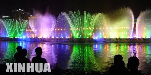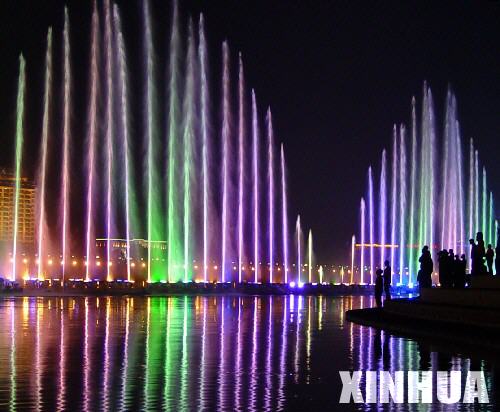 資料圖片:這是吉林市2004年在松花江上建起的272米長(zhǎng)的漂浮式七彩音樂(lè)噴泉。新華社發(fā)(朱萬(wàn)昌攝)