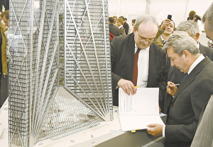 高度為612米的摩天大廈“俄羅斯塔”18日在莫斯科正式奠基。該項(xiàng)目預(yù)計(jì)2012年建成,有望成為歐洲第一高樓。莫斯科市長尤里·盧日科夫(圖左)在“俄羅斯塔”奠基儀式上稱該項(xiàng)目為“俄羅斯歷史上前所未有的”。“俄羅斯塔”的設(shè)計(jì)者是英國著名建筑師諾曼·福斯特。福斯特在參加奠基儀式時(shí)表示,“俄羅斯塔”具有很高的安全性和穩(wěn)定性。