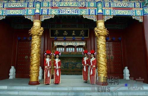 據(jù)介紹,這座王府大院面積近5000平方米,能同時容納20人住宿,完全復(fù)制當(dāng)年的王爺生活場景,雖然殿內(nèi)擺設(shè)大部分為仿制品,但件件都價值不菲,如用紅木手工雕刻了999條龍的王爺龍榻就價值180萬元人民幣,已有百年歷史的手搖留聲機及清朝宮廷綠如意珠簾也都價值連城。王府內(nèi)的長廊都由穿著綠營軍裝的侍兵守衛(wèi),服務(wù)人員也都穿著仿清朝宮廷服飾,“服務(wù)沿用清朝的宮廷禮儀,顧客不僅可以享用到滿漢全席,還可以體驗到當(dāng)年王爺?shù)拇觥!币晃讳N售人員告訴記者。