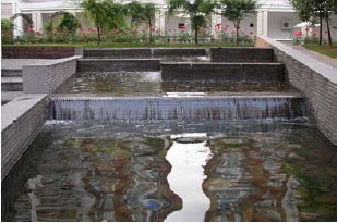 光和水的互相作用是水景景觀的精華所在,倒影池就是利用光影在水面形成的倒影,擴大視覺空間,豐富景物的空間層次,增加景觀的美感。倒影池極具裝飾性,可做的十分精致,無論水池大小都能產(chǎn)生特殊的借景效果,花草、樹木、小品、巖石前都可設置倒影池。