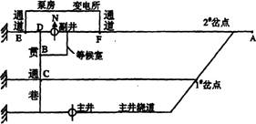 ?、僭谥?、副井貫通巷和主井繞道采用壓入式通風(fēng)(3分),在主井井筒內(nèi)再安一趟風(fēng)筒(1分),采用抽出式通風(fēng)(1分)。優(yōu)點(diǎn)是井筒空氣相對(duì)清潔,缺點(diǎn)是需多增加一趟風(fēng)筒(2分)。