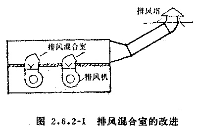 對策:合理地選擇風(fēng)道斷面。在每臺風(fēng)機出口加裝開閉靈活且嚴(yán)密的單流閥。管路盡量減少局部阻力。在排風(fēng)混合室內(nèi)設(shè)一段隔墻,使風(fēng)機出口處的高速氣流互不干擾而通暢地到達(dá)排風(fēng)塔,且每臺排風(fēng)機的出風(fēng)口進(jìn)入混合室時,都加一個45度彎頭,氣流方向直接對準(zhǔn)排風(fēng)塔的通道。如圖2.6.2-1.