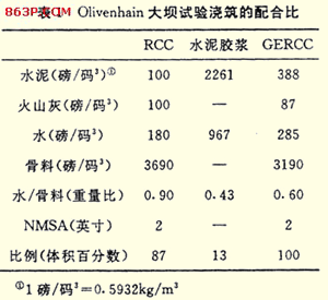 Olivenhain大壩的RCC澆筑試驗包括GERCC作為護面系統(tǒng)和作為RCC與巖石的接觸面的壩肩處理兩種情況的研究。該過程的第一步是選定GERCC的目標配合比;旌狭显O計過程的基本途徑是將RCC改變成坍落度約為7~10cm ,抗壓強度為20.6MN/m2的非加氣常規(guī)混凝土。采用ACI211中的標準慣例 ,GERCC要求膠結材料的含量約281.7kg/m3和含水量169kg/m3.由于RCC配合比是預先確定的,因此水泥漿的配合比和水泥膠漿與RCC的比率即為獲得理想的GERCC混合料的剩余變量,這些值是計算得出的。表1所示的水泥膠漿、RCC和GERCC各自的配合比是第一次澆筑試驗用的!