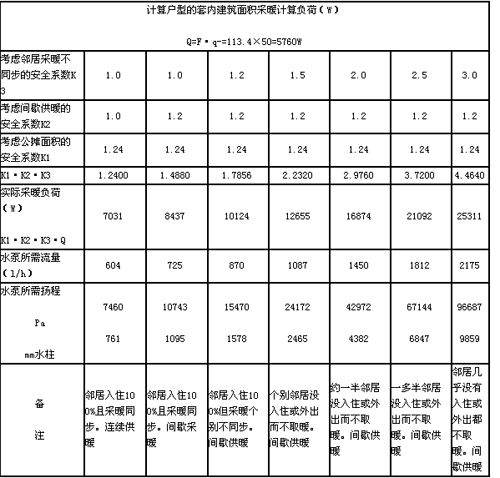 在式(3)中,L—水泵的計算流量,l/h;K1、K2、K3同式(2);△t—供回水平均溫差,℃,在此取△t=10;C—水的比熱,KJ/Kg·℃,其值為4.19;r—水的比重,Kg/l;其值為1;Q—計算戶型的采暖計算負荷,W,一般應按采暖負荷計算方法得出結果,當然也可用負荷指標來估算: