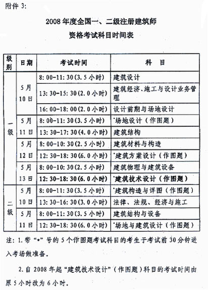2008年度全國一、二級注冊建筑師資格考試時間為5月10日—13日,具體科目時間表見附件3.