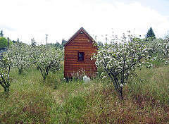 在他的小床上透過教堂般的小窗可以看到加利福尼亞的美麗天空。在潔凈的辦公空間里,便攜計(jì)算機(jī)緊挨著書架。這個小房子充滿特色,特別是在古典門廊前面,竟然有一棵郁郁蔥蔥的蘋果樹。