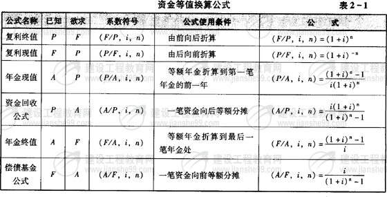 本節(jié)內(nèi)容有3個(gè)重點(diǎn),資金時(shí)間價(jià)值的相關(guān)概念、資金等值計(jì)算、名義利率與有效利率。資金時(shí)間價(jià)值的絕對尺度是利息,相對尺度是利率,教材中關(guān)于利息、利率的含義、決定因素、作用等內(nèi)容應(yīng)注意理解。資金等值計(jì)算要求六個(gè)公式必須熟記,并會(huì)靈活運(yùn)用,近年來在此處出題都是復(fù)雜現(xiàn)金流量的計(jì)算題,綜合性較強(qiáng)。一方面要求考生知道公式適用的條件,另一方面要求能用公式正確地進(jìn)行計(jì)算。尤其要注意正確地畫現(xiàn)金流量圖,是資金等值計(jì)算的前提條件。年金計(jì)算一般比較容易出錯(cuò)。資金等值計(jì)算公式見表2-1.