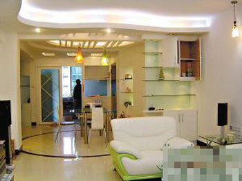 客廳和餐廳相連,但需要有所區(qū)分。設(shè)計(jì)師將餐廳地面設(shè)計(jì)成圓形,用深色瓷磚鋪設(shè)圓形的界限。與之相呼應(yīng),餐廳的天花也設(shè)計(jì)成圓形,中間設(shè)計(jì)一些木的假梁,吊燈從梁中間垂垂而下,視覺(jué)上比較有藝術(shù)效果,有田園之風(fēng),感覺(jué)好像從稻草中垂下?蛷d的天花采用了圓弧形,流線型的天花,燈光在天花流線的邊緣透出,給人浪漫、自由的感覺(jué)?蛷d與餐廳交接處設(shè)計(jì)了放置裝飾品的玻璃層架,層架的下層設(shè)置木柜,方便主人放雜物。