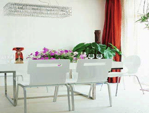 客廳與餐廚空間是開(kāi)放貫通的,白色的鋼架桌椅,剔透的水晶吊燈和酒具,一捧盛放的鮮花,格外養(yǎng)眼。