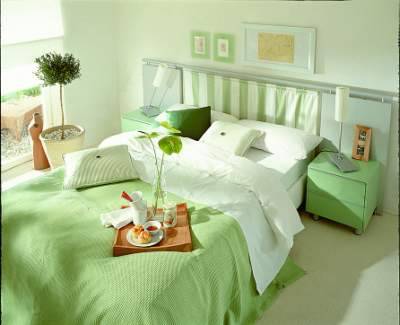 淡淡的果綠色會(huì)給房間帶來(lái)清新甜美氛圍。果綠色的床品,一對(duì)綠、白色的靠墊和小型花插讓自然氣息更加質(zhì)樸濃郁。
