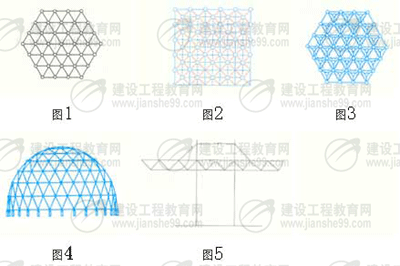 4、曲面網(wǎng)架體系:如球殼(圖4)、筒殼、扭殼、錐體等。