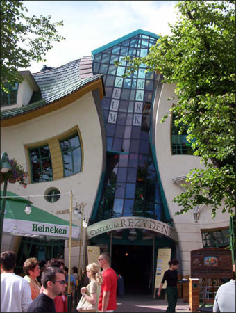 位于波蘭索波特市,是一家生意興隆的購物中心的附屬建筑,已成為當(dāng)?shù)刂糜尉包c(diǎn)。它建于2004年,樓身呈扭曲的褶皺形,就像一棟喝醉酒后醉態(tài)可掬的卡通房子。這棟房子之所以會(huì)這樣扭來扭去,主要是因?yàn)樵O(shè)計(jì)者參照了杰·馬辛·賽瑟及皮爾·達(dá)赫爾博格這兩名畫家的畫作,盡情發(fā)揮創(chuàng)意。房子的用色也是夸張而鮮明,奪目的蔚藍(lán)、跳躍的鮮綠、暖暖的淺黃……五顏六色的玻璃及各種裝飾都給人留下深刻印象。由于房子的外觀如此俏皮奇特,索柏市市長杰克·簡奴斯基于是將其命名為“扭曲的房子”。