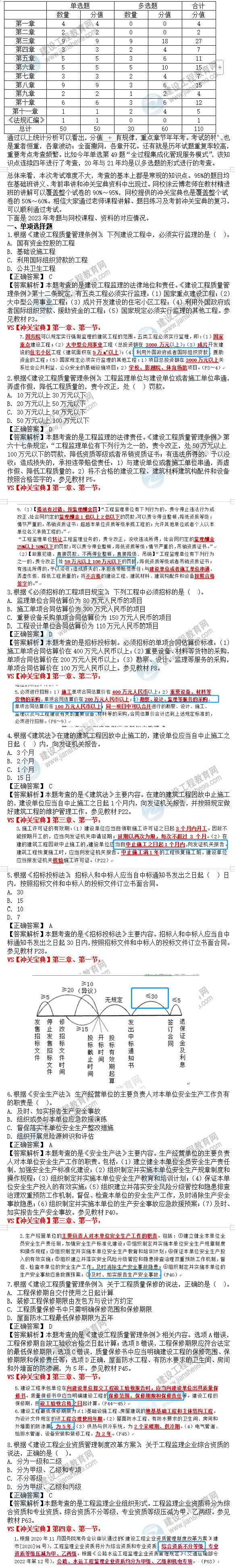 對(duì)于23年教材新增內(nèi)容本次考試有所考查,3道單選和2道多選,共計(jì)7分。分別涉及的知識(shí)點(diǎn)為第四章第一節(jié)工程監(jiān)理企業(yè)中的“構(gòu)成監(jiān)理企業(yè)資質(zhì)等級(jí)”(1單1多)、第十章第一節(jié)項(xiàng)目管理知識(shí)體系中的“項(xiàng)目利益相關(guān)者管理”(1單)、第十章第二節(jié)建設(shè)工程風(fēng)險(xiǎn)管理中的“《風(fēng)險(xiǎn)管理指南》ISO31000”(1單1多)。值得注意的是教材新增內(nèi)容會(huì)是當(dāng)年及今后兩年考試的熱點(diǎn),需要大家在學(xué)習(xí)過(guò)程中重點(diǎn)關(guān)注。