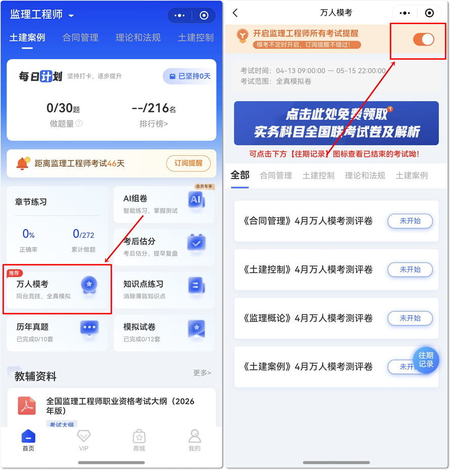 2026年全國(guó)監(jiān)理工程師4月萬(wàn)人??紒?lái)襲!??荚嚲聿捎萌婺M卷,根據(jù)新教材篩選整理,幫助大家提前考場(chǎng)演練!本次為監(jiān)理考前最后一次模考大賽,請(qǐng)各位考生提前預(yù)約。