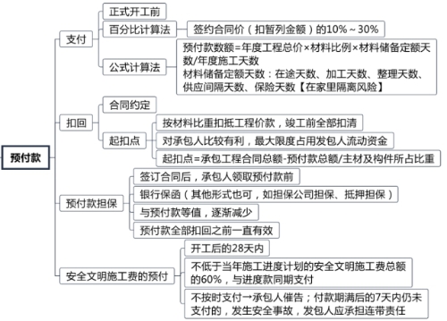 1.工程預付款是由發(fā)包人按照合同約定,在正式開工前由發(fā)包人預先支付給承包人,用于購買工程施工所需的材料和組織施工機械和人員進場的價款。