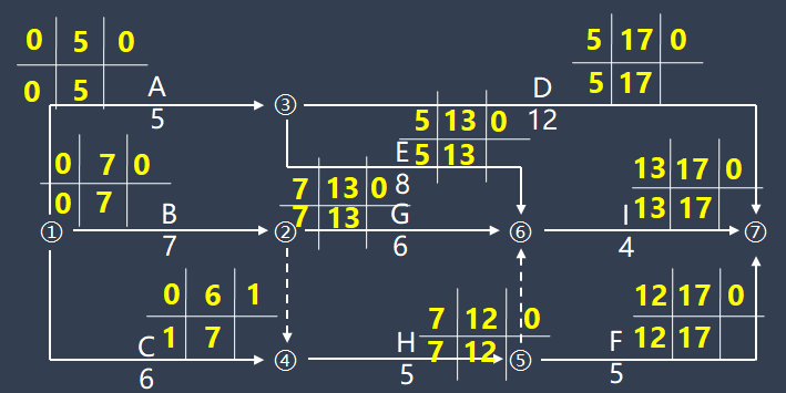 通過以上分析可以得出關(guān)鍵線路為:①③⑦、①③⑥⑦、①②⑥⑦,關(guān)鍵線路的持續(xù)時間為17,關(guān)鍵線路上各工作的總時差都為0,所有關(guān)鍵工作的間隔時間均為0。