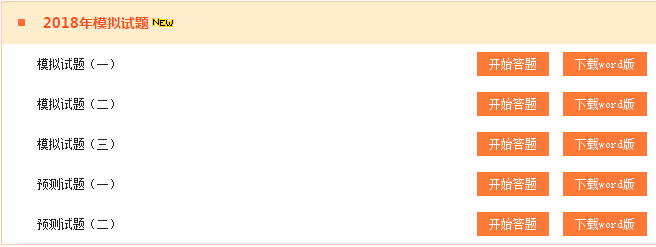 點擊題庫之后,找到“2018年模擬試題”,就可以找到5套試題了,可在線做題也可下載word進(jìn)行練習(xí)。