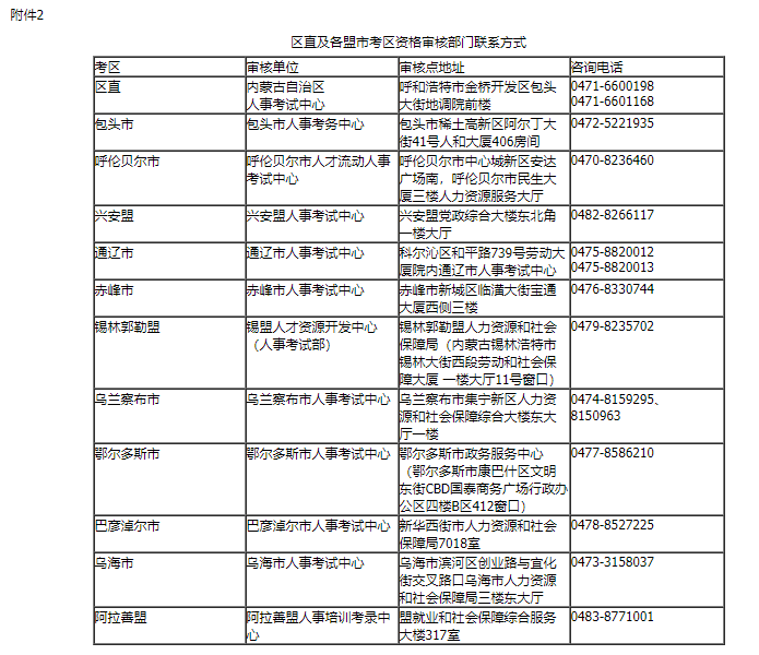 2.區(qū)直及各盟市考區(qū)資格審核部門聯(lián)系方式