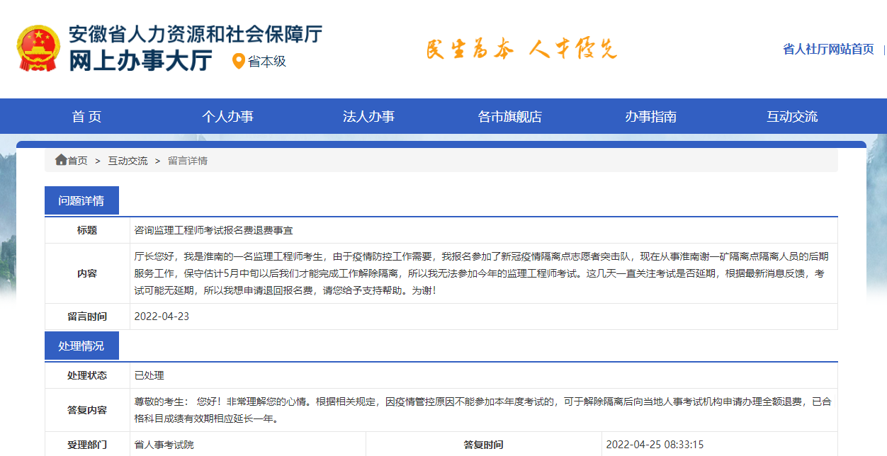 因疫情原因不能參加監(jiān)理考試報(bào)名費(fèi)怎么處理?安徽省人社局這樣回答