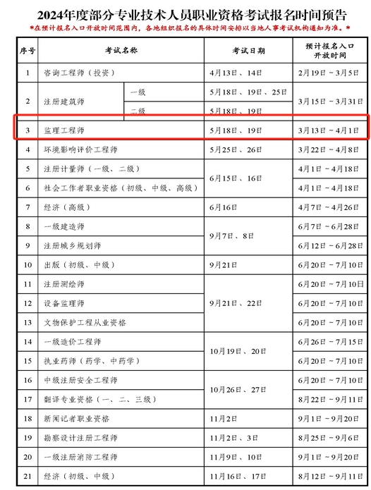 中國人事考試網(wǎng)公布2024年監(jiān)理工程師報(bào)名時(shí)間3月13-4月1日