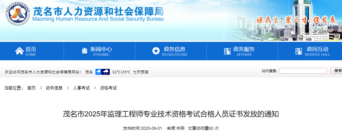 廣東茂名市2025年監(jiān)理工程師專(zhuān)業(yè)技術(shù)資格考試合格人員證書(shū)發(fā)放的通知