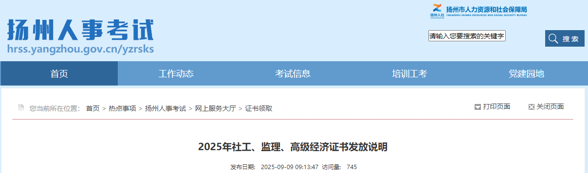 2025年社會工作者、監(jiān)理工程師、高級經(jīng)濟(jì)師證書已到。考生可登錄江蘇省人事考試網(wǎng)上業(yè)務(wù)辦理平臺(jiangsu.nomax.vip/bas)申請到付郵寄,現(xiàn)場發(fā)放地址邗江中路98號(市考試中心位于揚(yáng)州市工業(yè)職業(yè)技術(shù)學(xué)院內(nèi)華揚(yáng)樓東側(cè)一樓服務(wù)大廳,請配合學(xué)校保衛(wèi)進(jìn)行登記,證書憑考生身份證原件領(lǐng)取)。