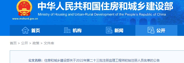 住建部關于2022年第二十三批注冊監(jiān)理工程師初始注冊人員名單的公告