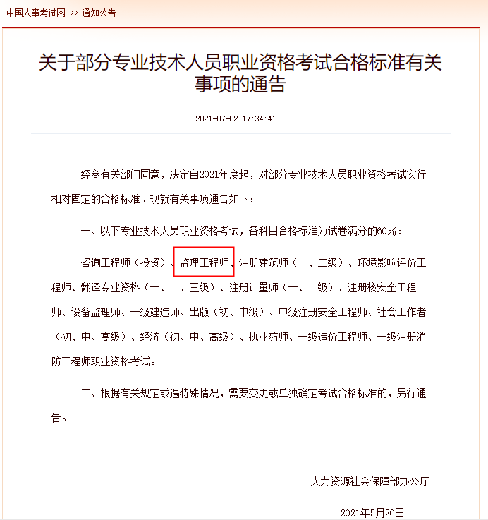 2021年監(jiān)理工程師考試成績(jī)已經(jīng)公布,大家都考的怎么樣?合格分?jǐn)?shù)大家都了解了嗎?中國(guó)人事考試網(wǎng)發(fā)布了監(jiān)理工程師考試成績(jī)合格標(biāo)準(zhǔn),一起來(lái)看一看~