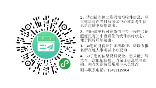 1. 填報信息的“姓名”即為“收件人姓名”,請務必與資格證本人的姓名一致。身份證必須與報名考試時的信息一致,請?zhí)顚懻_的聯(lián)系方式,否則不予受理。