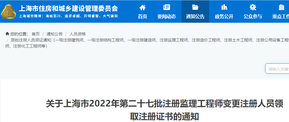 上海2022年第二十七批注冊監(jiān)理工程師變更注冊人員領(lǐng)取注冊證書的通知