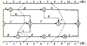 1、某工程雙代號(hào)時(shí)標(biāo)網(wǎng)絡(luò)計(jì)劃執(zhí)行到第3周末和第7周末時(shí),檢查其實(shí)際進(jìn)度如下圖前鋒線所示,檢查結(jié)果說(shuō)法錯(cuò)誤的是(?。?/p>