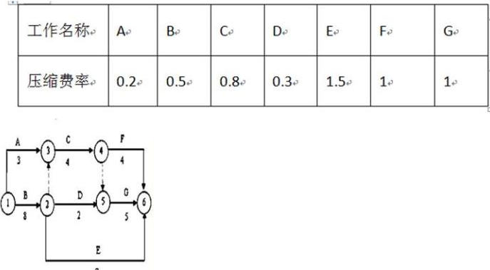 對下面雙代號網(wǎng)絡圖進行工期優(yōu)化,當各工作壓縮費率如下所示時,欲壓縮總工期1天,應當選擇( )進行壓縮。