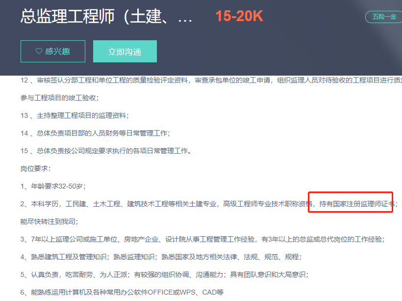 這是小編在某招聘軟件上截取的招聘要求及薪資,可以看出持有監(jiān)理工程師證書的總監(jiān),薪資并不是很低,付出一定會有所收獲,所以大家一定不要被外面的言語所困,符合監(jiān)理工程師報(bào)名條件,能報(bào)考監(jiān)理工程師考試的一定要報(bào)名,不給自己一次機(jī)會,永遠(yuǎn)都不知道自己可以達(dá)到什么樣的高度,不固步自封,該學(xué)習(xí)學(xué)習(xí),該努力努力,甭管大家怎么說,同樣的機(jī)會放在面前,相信考下證書的你一定會比沒考下的人機(jī)會更多~