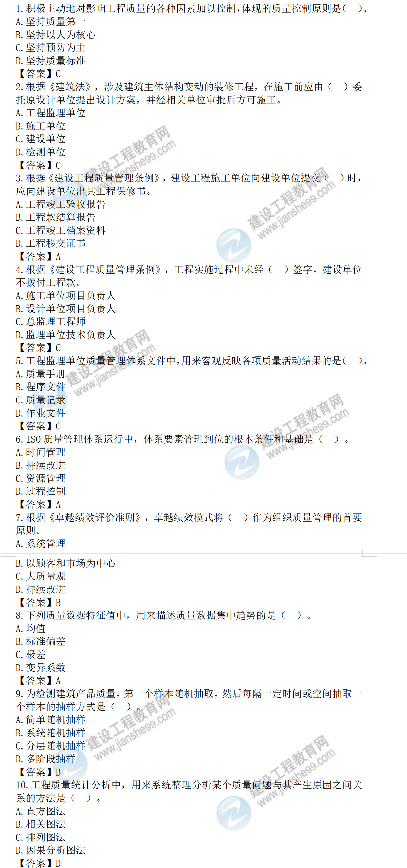 2022年監(jiān)理工程師目標(biāo)控制土建考試答案1-10題(補(bǔ)考)