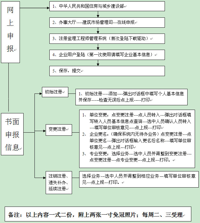 (三)專業(yè)變更:1、變更注冊(cè)申請(qǐng)表,2、注冊(cè)監(jiān)理工程師注冊(cè)執(zhí)業(yè)證書(shū)原件,3、相關(guān)專業(yè)繼續(xù)教育證明;
