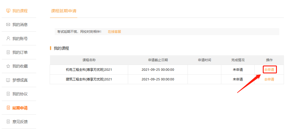 之前已經(jīng)報(bào)名網(wǎng)校2021年一級建造師考試課程的同學(xué),可以申請延期課程了,入口在“我的網(wǎng)校我的家”,請大家及時申請,不要錯過。