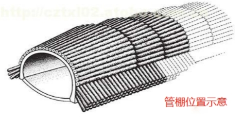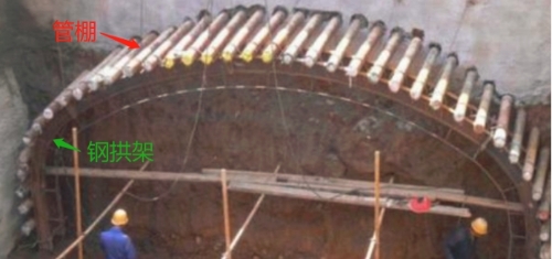 管棚是在施工隧道工程中,向前開挖之前就先圍著開挖輪廓線的外側向開挖前方以一個非常小的外插角(近乎平行于隧道)插入到土體的。