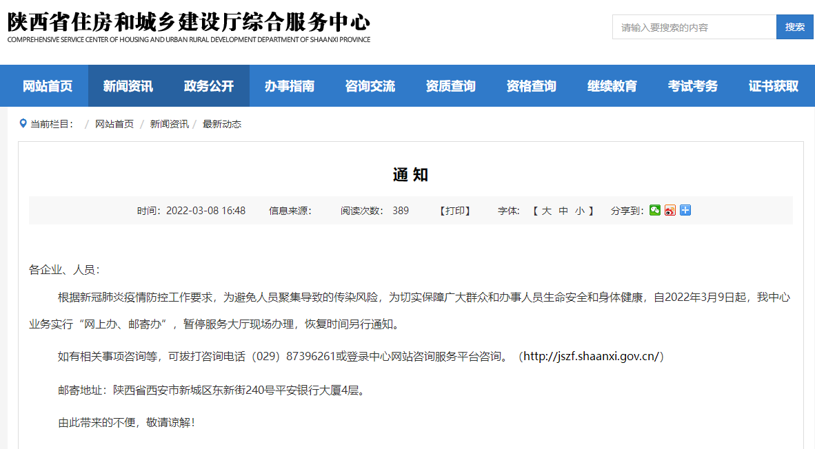 陜西省住建廳綜合服務(wù)中心實(shí)行“網(wǎng)上辦、郵寄辦”暫停服務(wù)大廳現(xiàn)場(chǎng)辦理