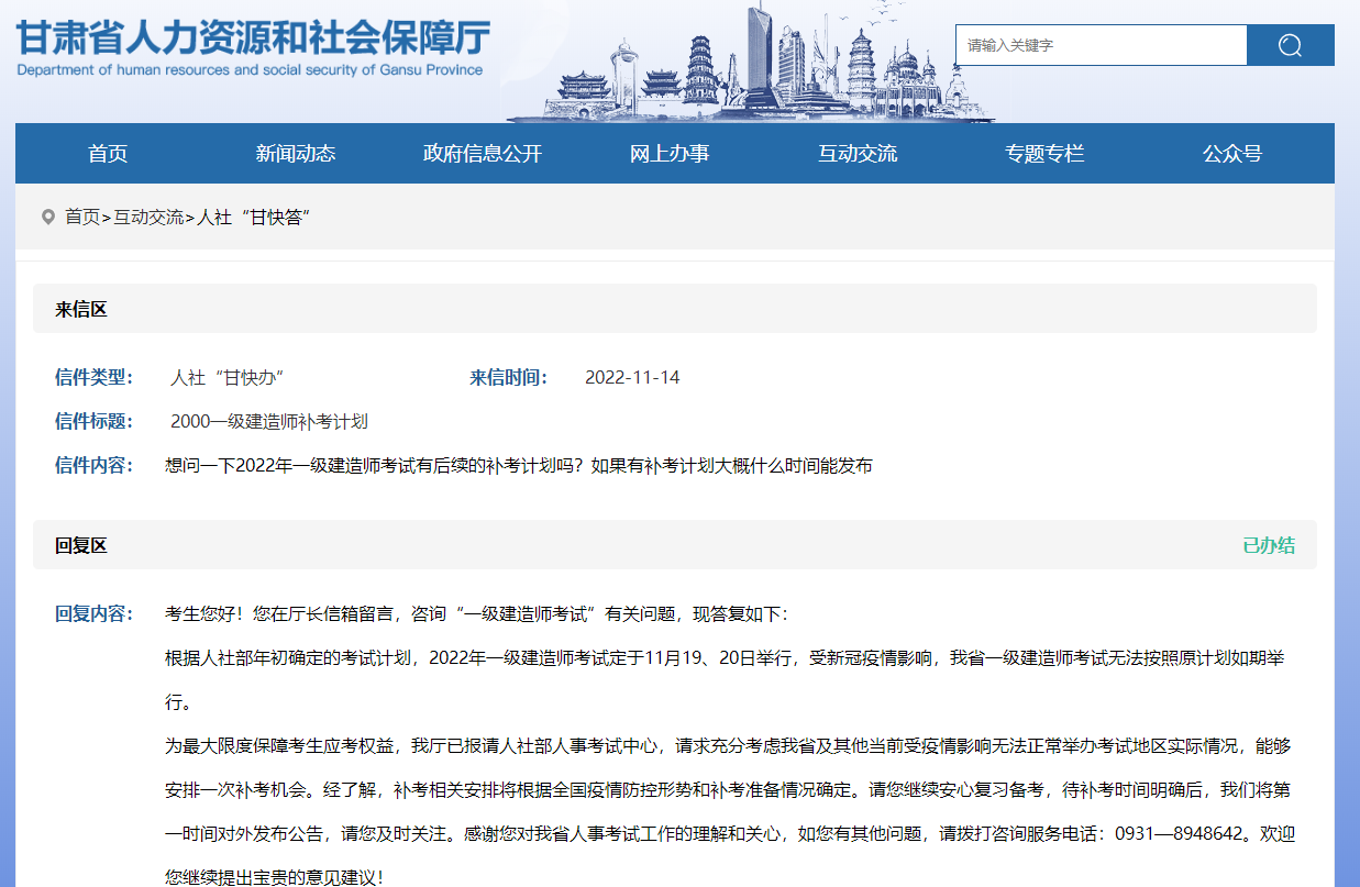 近期,一建學員就一建補考時間在【甘肅省人力資源和社會保障廳-廳長信箱留言】做出了提問,并得到回復,詳情如下↓↓↓