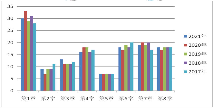 今年考試比較常規(guī),和往年相比,難度不大,大部分都是教材原文知識點(diǎn),也沒有那些彎彎繞繞。就今年的考情分析,各章節(jié)分值基本沒有太大變化,考點(diǎn)分布較綜合,大多數(shù)考生反映《法規(guī)》試題相對簡單,下面就讓我們看一下近五年試題分值的分布情況: