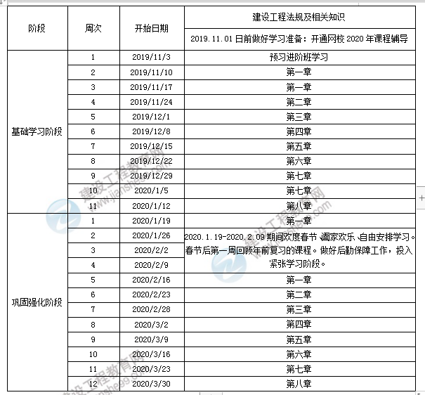 2、已報網(wǎng)校2020年以及建造師輔導特色暢學班/超值精講班/高效取證班/無憂直達班/VIP簽約特訓營的同學,將由班主任老師根據(jù)您的信息反饋及學習時間制定更詳盡的計劃表,如與本表不一致,請以班主任老師制定的學習計劃為準。