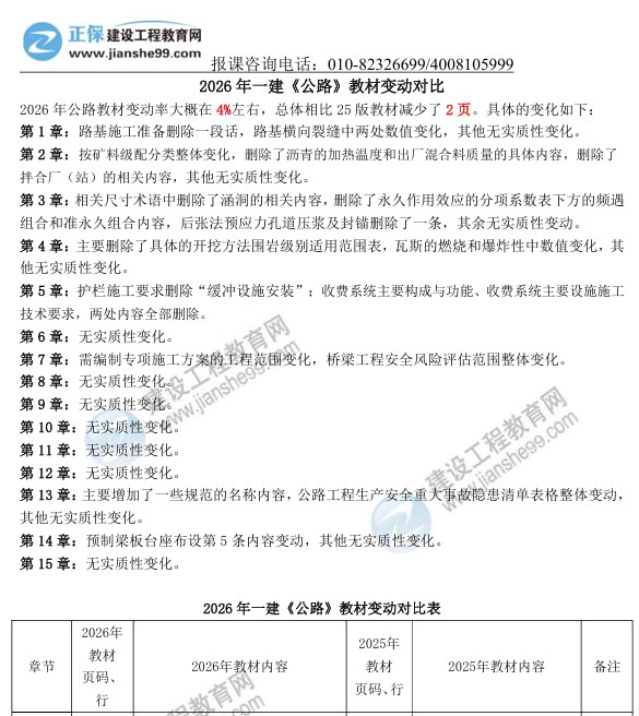 2026年一級(jí)建造師《公路工程》新教材變動(dòng)對(duì)比來(lái)嘍!建設(shè)工程教育網(wǎng)教務(wù)團(tuán)隊(duì)拿到教材后第一時(shí)間為大家梳理變動(dòng)詳細(xì)內(nèi)容,經(jīng)核對(duì),2026年公路工程科目整體變動(dòng)約4%,教材變動(dòng)內(nèi)容如下,更多變動(dòng)解讀請(qǐng)關(guān)注1月7日20:00聶旺老師直播間!直播入口>>