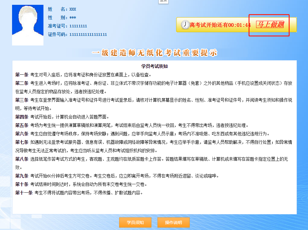 第二步:請認(rèn)真閱讀模考說明,并點擊“馬上做題”按鈕,注意答題15分鐘以上成績有效。