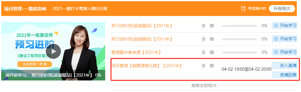 點(diǎn)擊我的課程—項(xiàng)目管理—項(xiàng)目管理[刷題課第五期]2021—點(diǎn)右側(cè)進(jìn)入直播—進(jìn)入后即可觀(guān)看直播!